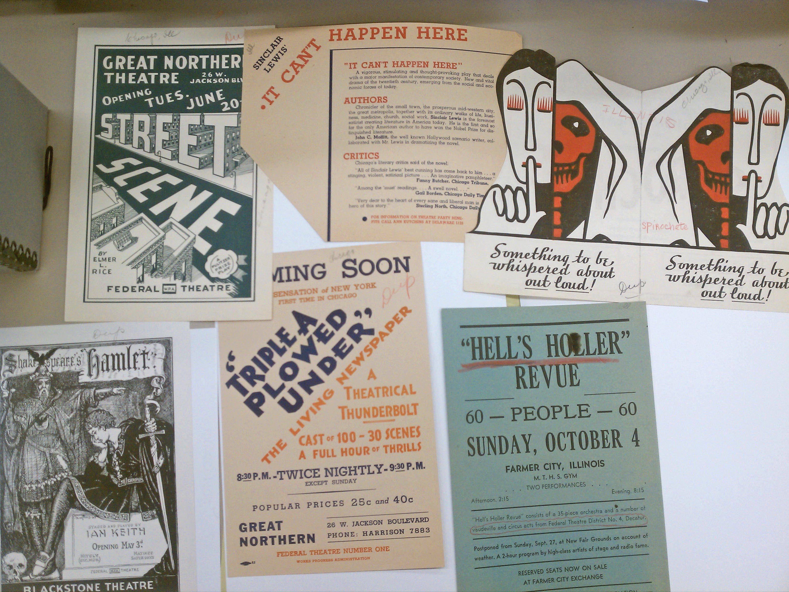 The above photograph provides a glimpse into the contents of the Illinois folder. Plays represented include “Street Scene”, “It Can’t Happen Here”, “Spirochete”, “Hamlet”, “Triple A Plowed Under”, and “Hell’s Holler Revue”. All productions date from circa 1936 to 1939. This folder contains seven items total and the six pictured here are all promotional flyers. These flyers provide colorful and engaging typography and overall design.