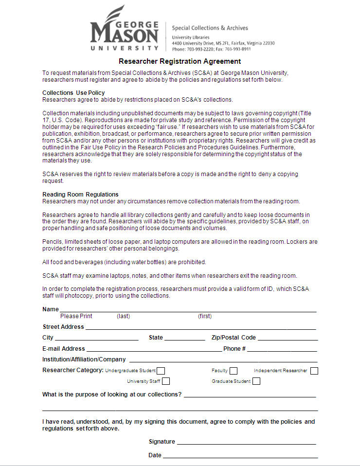 In order to protect and insure the continued accessibility of our holdings, Special Collections & Archives (SC&A) at George Mason University Libraries has made some changes to its policies governing the access and use of our materials. These changes have been implemented in accordance with the national standards and guidelines established by ALA’s Association of College and Research Libraries and the Rare Books and Manuscripts Section (http://www.rbms.info/standards/index.shtml). These policies will be applied consistently to and enforced equally with all users with no exceptions.