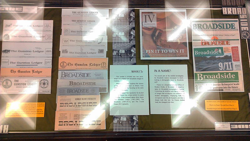Special Collections & Archives is happy to announce a new exhibit is on display in Fenwick Library featuring materials from the University Archives. The exhibit is divided into two parts: What’s in a Name? and Broadside Images in Context. This exhibit draws on materials from the George Mason University Broadside photograph collection and issues of The Gunston Ledger, Broadside, and Fourth Estate student newspapers.