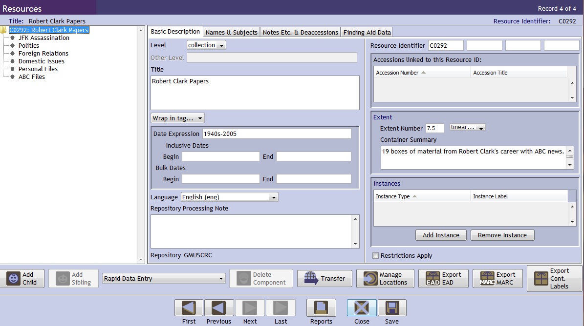 We currently use Archivists’ Toolkit for our collections. After the boxes are organized and the Excel inventory was created, I filled in the necessary information such as the description and container summary. I listed the six series that I thought best organized the collection and I added notes about copyright, restrictions, the donation and other details that go on our finding aids. Once that is completed, I hit the “Export EAD” button, which saves the file so it can be opened in Notetab and coded for our website. When all the coding is done, an html file is created and is made available to the public.