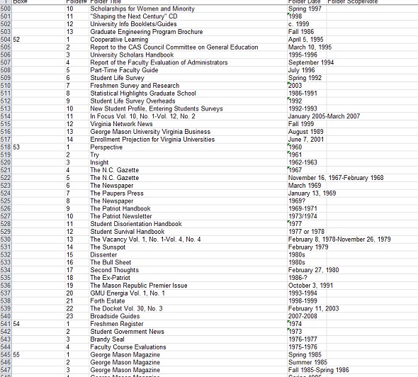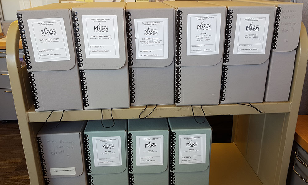 Special Collections Research Center keeps a number of materials from student and university publications dating as early as 1960. This includes everything from university pamphlets handed out during Mason Day festivals to copies of Fourth Estate’s predecessor Broadside. Recently, I have taken on the task of reorganizing and creating an inventory for the Student and University Publication collection to include any recent publications or additions to the collection. I look through each box within the collection and organize the folders inside, giving them a more accurate box number.
