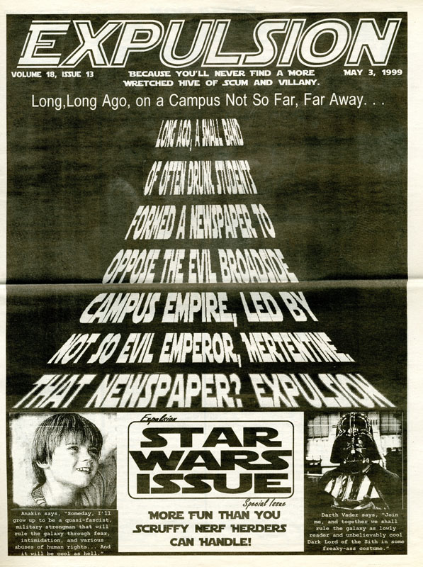 Expulsion’s special Star Wars issue in May of 1999. The cover features Expulsion’s own mission to oppose, “the evil Broadside Campus Empire, led by not so evil emperor, Mertentine.”