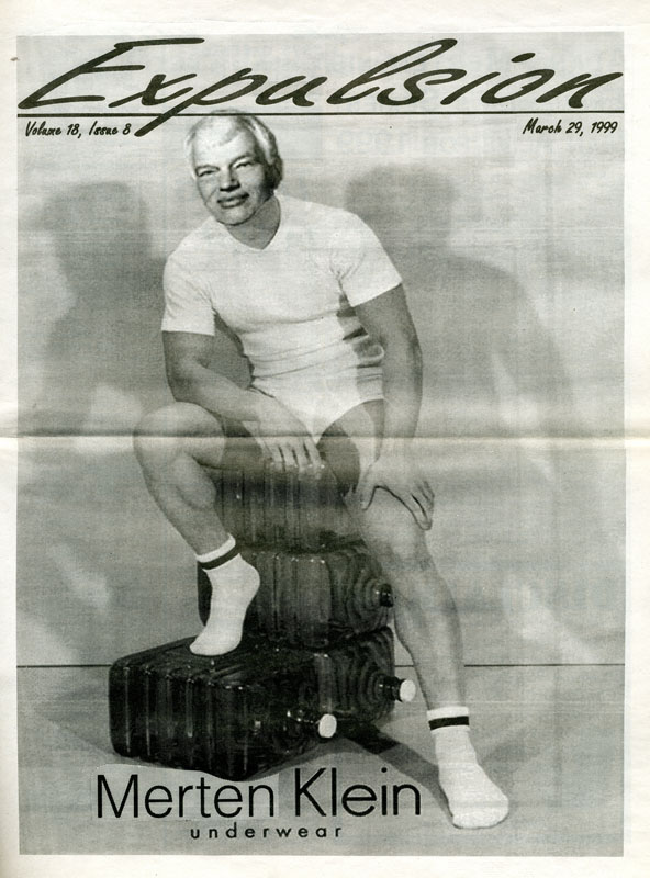 The cover of Expulsion’s 1999 April Fools issue, which features a (badly) photoshopped spread of former GMU President, Alan Merten, doing a “Merten” Klein underwear photoshoot.