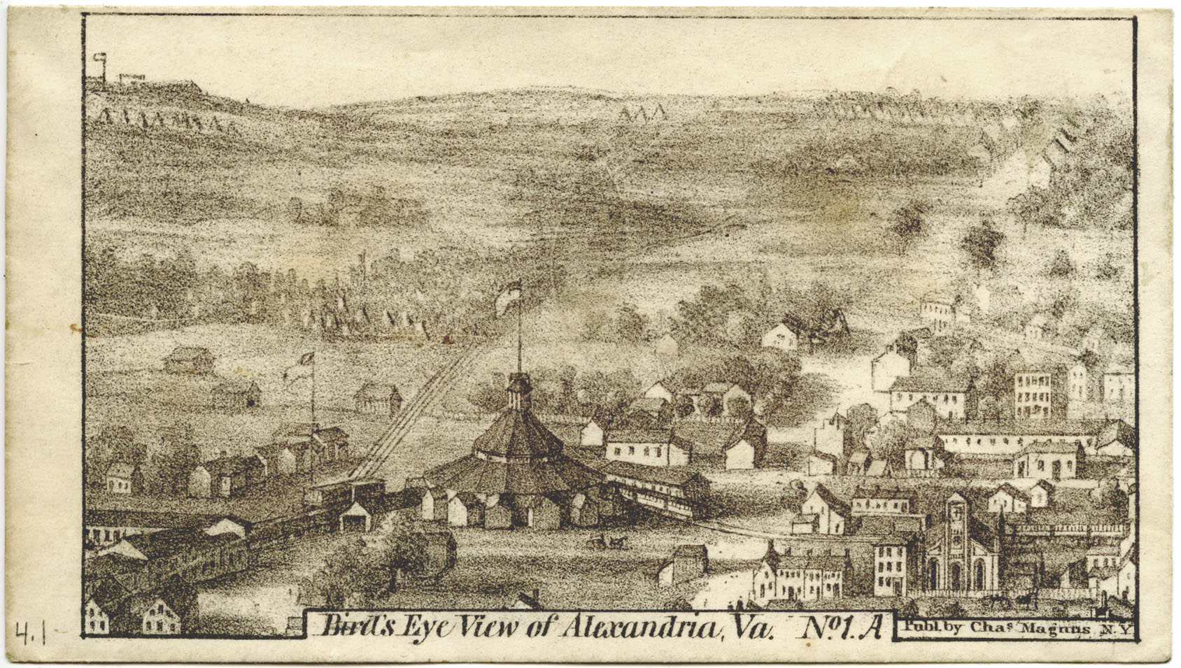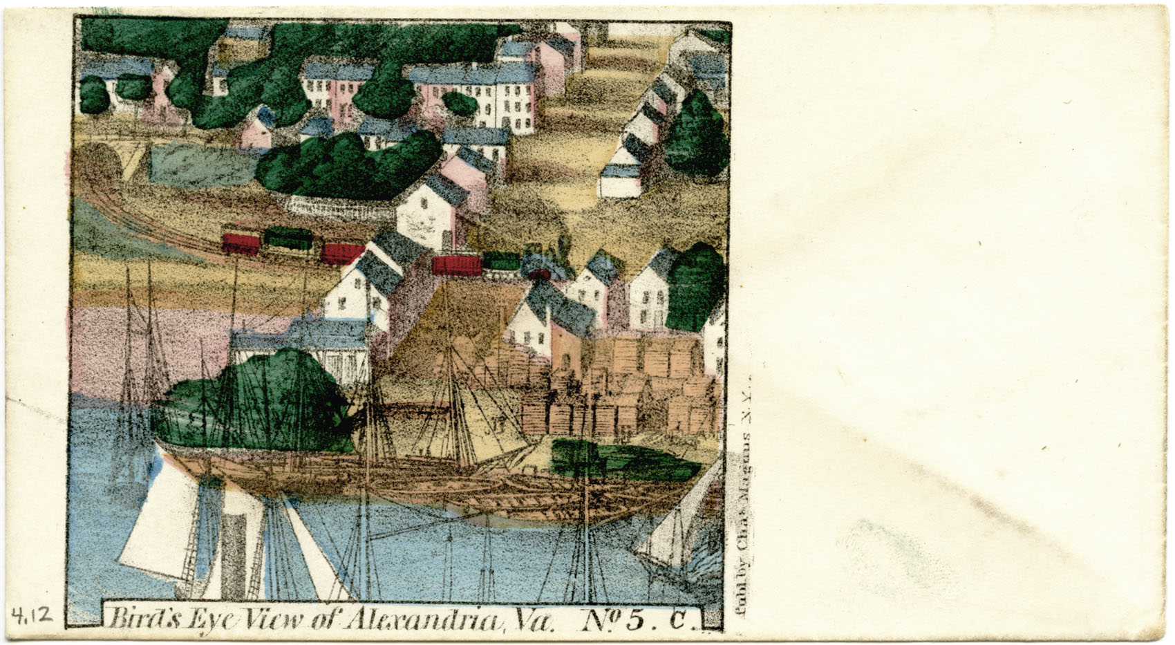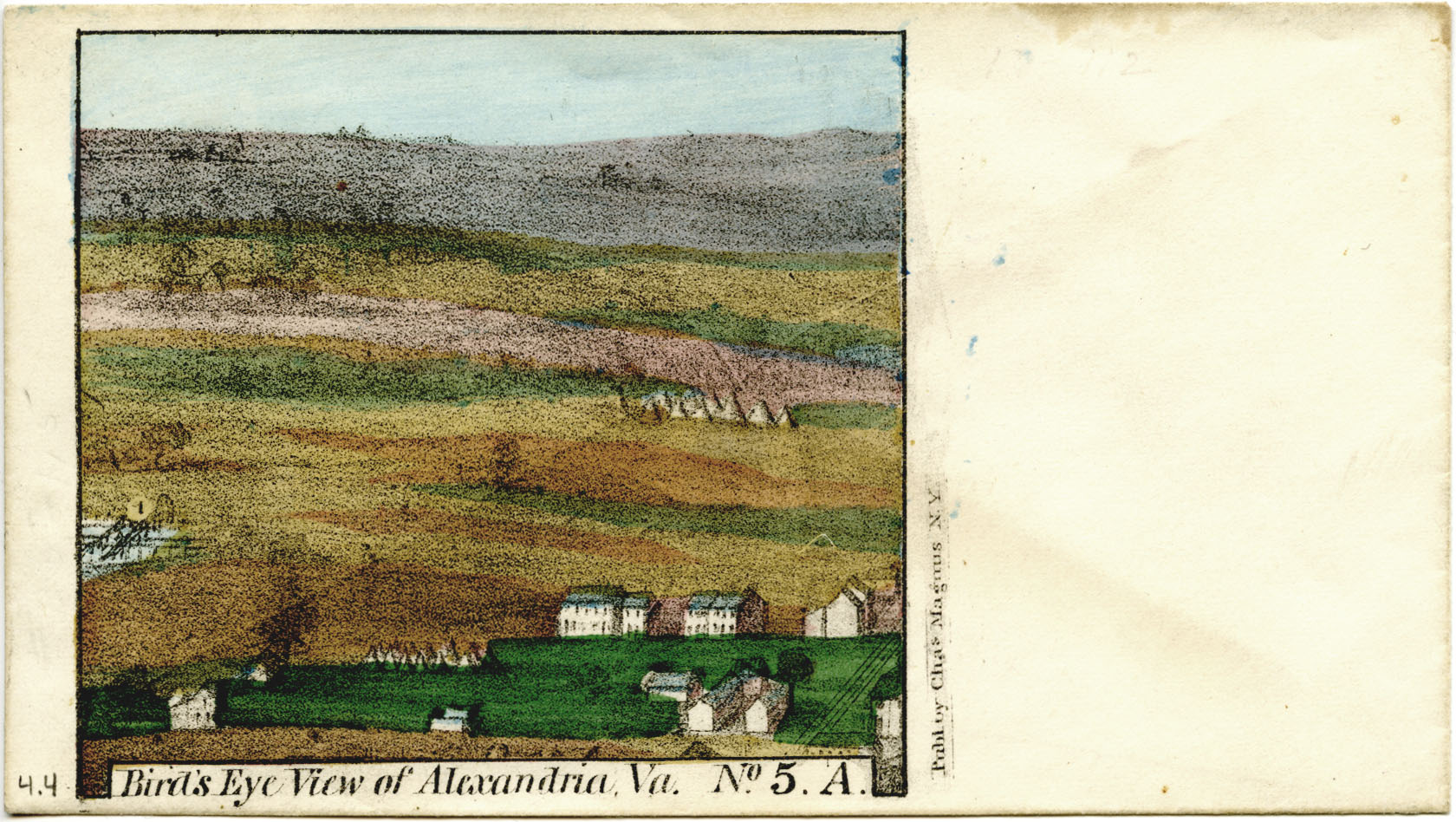 Magnus’s Civil War illustrations depicted scenes of civil war camps, battles, and portraits of military officials, but he specialized primarily in decorative patriotic stationary such as cards and envelopes. Although pictorial images comprise the majority of the collection, there are also numerous maps, most of which were produced by lithography. A number were produced for military purposes and employed by both the North and South alike. Maps made during the Civil War were often exceedingly accurate; their usefulness carried on into the twentieth century. Magnus’s lithograph series entitled, “Bird’s Eye View of Alexandria, Va”, are illustrated on well-preserved envelopes that are no larger than 3 inches by 5 inches and include a few that are hand colored! In 1798, German inventor, Alois Senefelder, created an innovated and revolutionary printmaking process that is now known as lithography. Lithography allows for artists to produce an unlimited set of images. This enabled Magnus to keep up with the high demands for his patriotic illustrations.