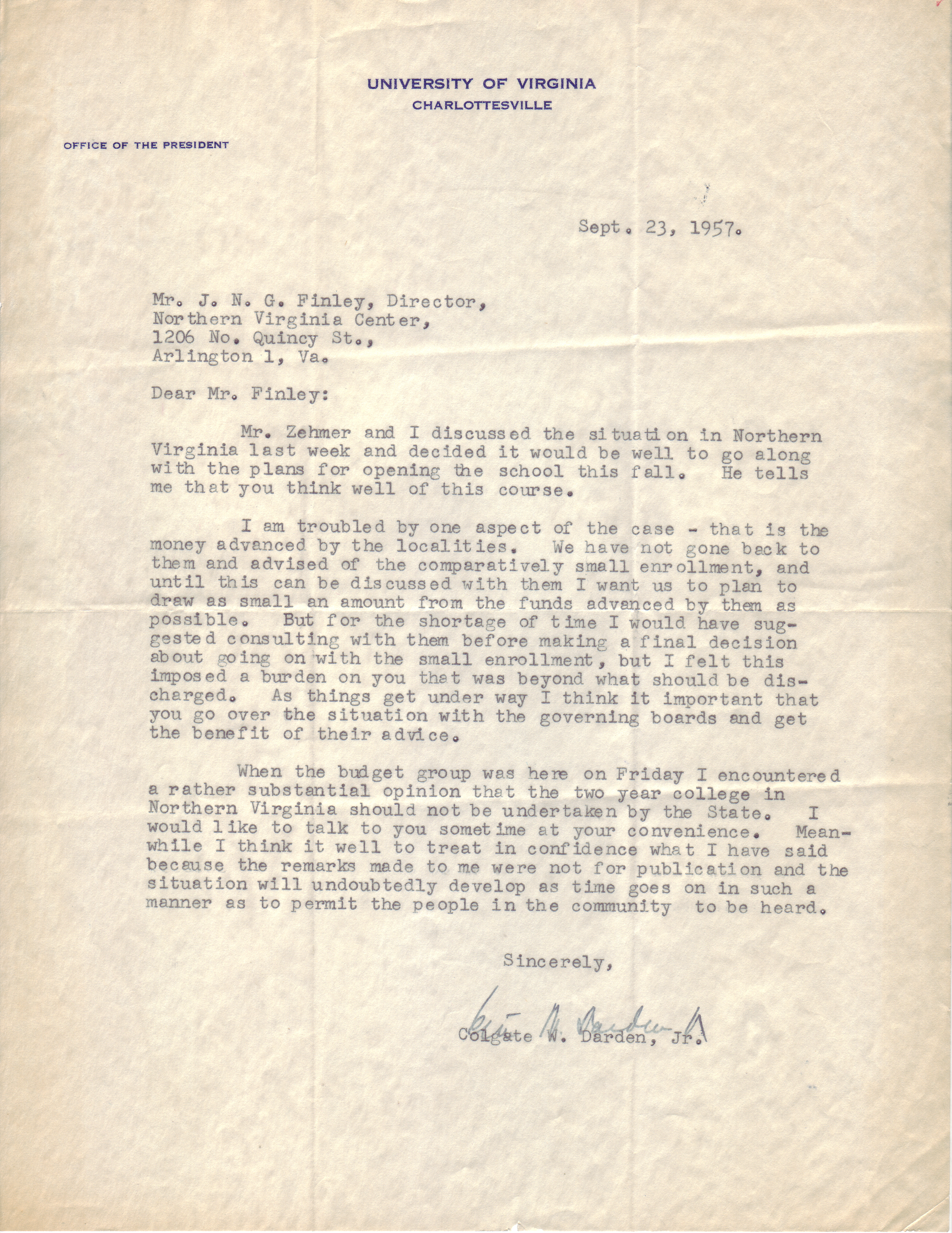 Letter to University College director, John N.G. Finley from University of Virginia president, Colgate W. Darden, Jr. regarding the opening of the branch college. George Mason University Facilities Records #R0017 Box 1, Folder 11. Special Collections Research Center, George Mason University Libraries.