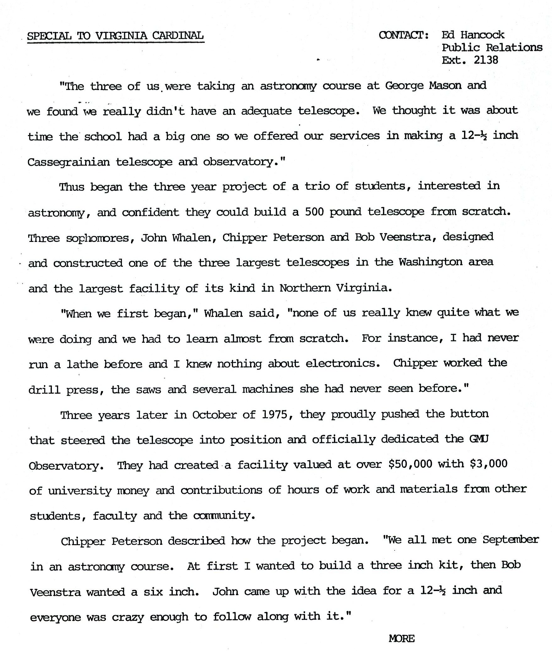 “Special to Virginia Cardinal,” January 1976, Office of University Relations Press Releases, #R0004, Box 8, Folder 10, Special Collections Research Center, George Mason University.