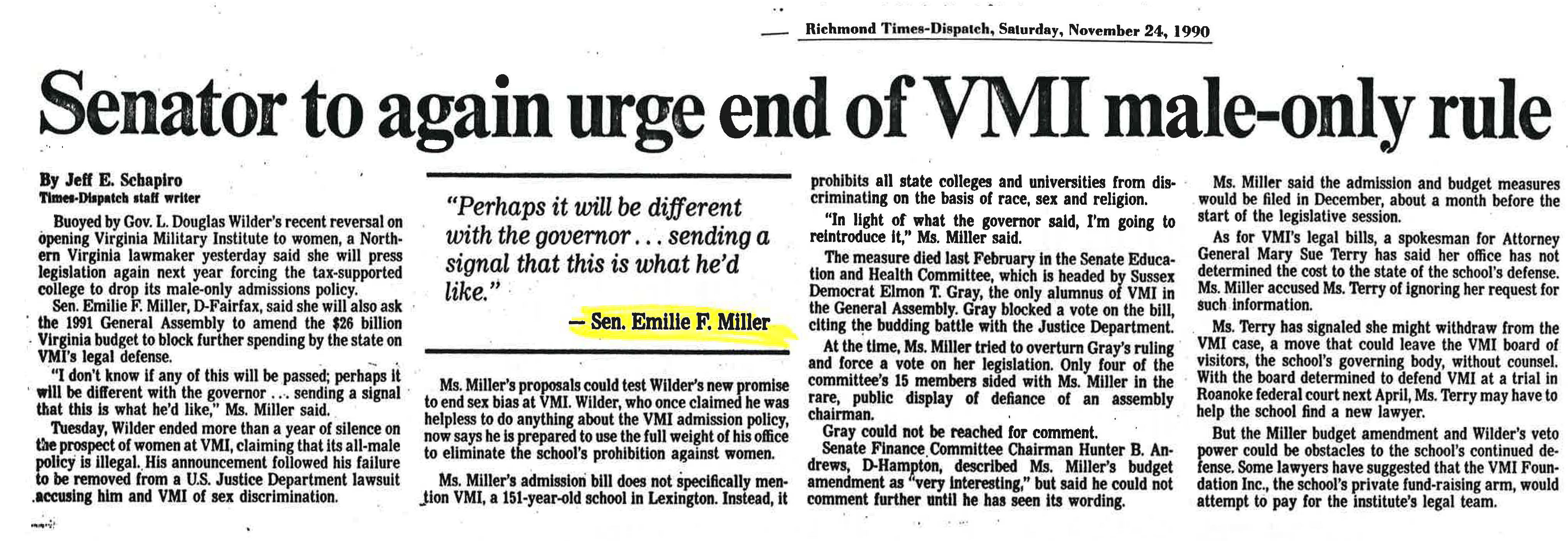 Hsu, Spencer. “Fairfax Senator Decries Coeducation at VMI”, The Washington Post. Jan. 10, 1997