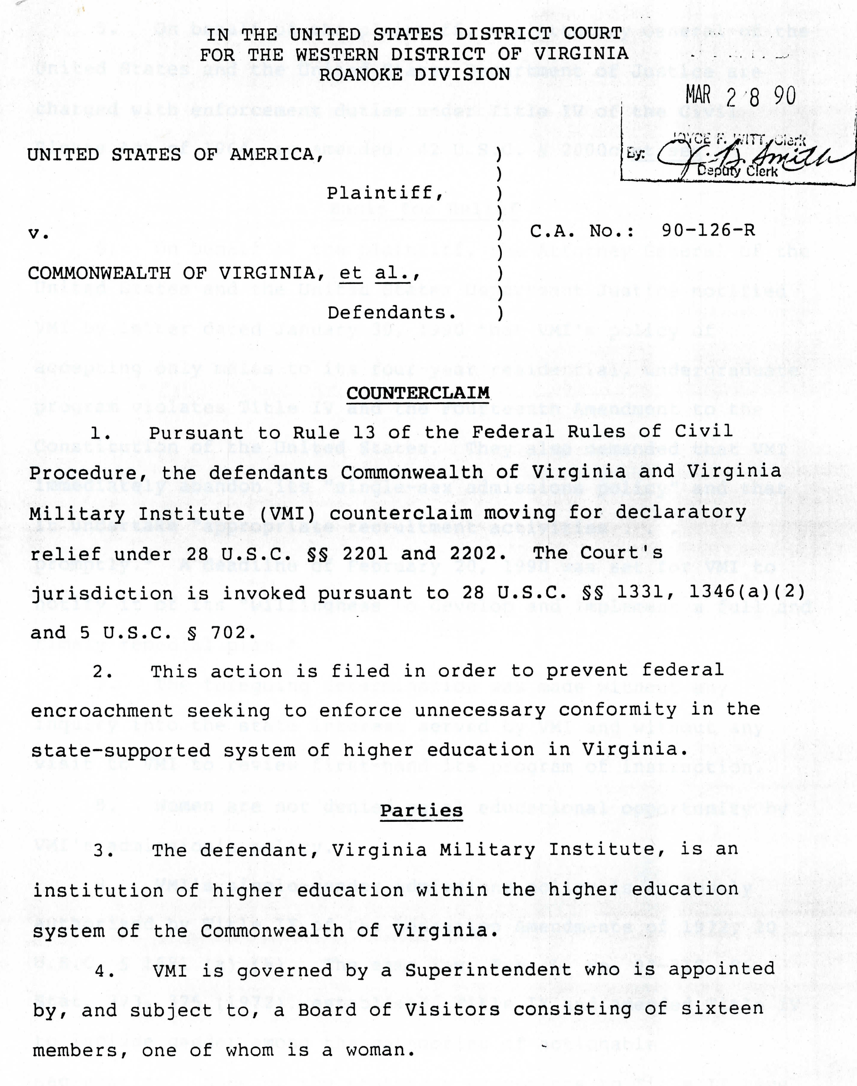 Miller’s most famous accomplishment is her role in the admittance of women to the Virginia Military Institute. For the entirety of its existence, the Virginia Military Institute had a male-only admittance policy. In 1991, VMI was the only all-male university left in the United States. Miller was able to use her position as a member of the Virginia Senate to bring light to this issue. Not only did she view the principle of male-only admittance as a sexist policy, but the fact that the school was a publicly funded university made the policy unconstitutional. While the case was moving its way up through the court systems, Miller helped pass legislation to prevent policies like these from continuing in Virginia. The law stated, “all public institutions of higher education shall admit qualified students without regard to race, sex, religion, national origin, or political affiliation.” The case would finally reach the Supreme Court where the policy was considered unconstitutional, and any policies similar would receive the same ruling. Justice Ruth Bader Ginsburg, in her majority opinion, stated that a policy or law such as VMI’s male-only policy is not compatible with equal protection as it “denies to women, simply because they are women, full citizenship stature-equal opportunity to aspire, achieve, participate in and contribute to society based on their individual talents and capacities.”