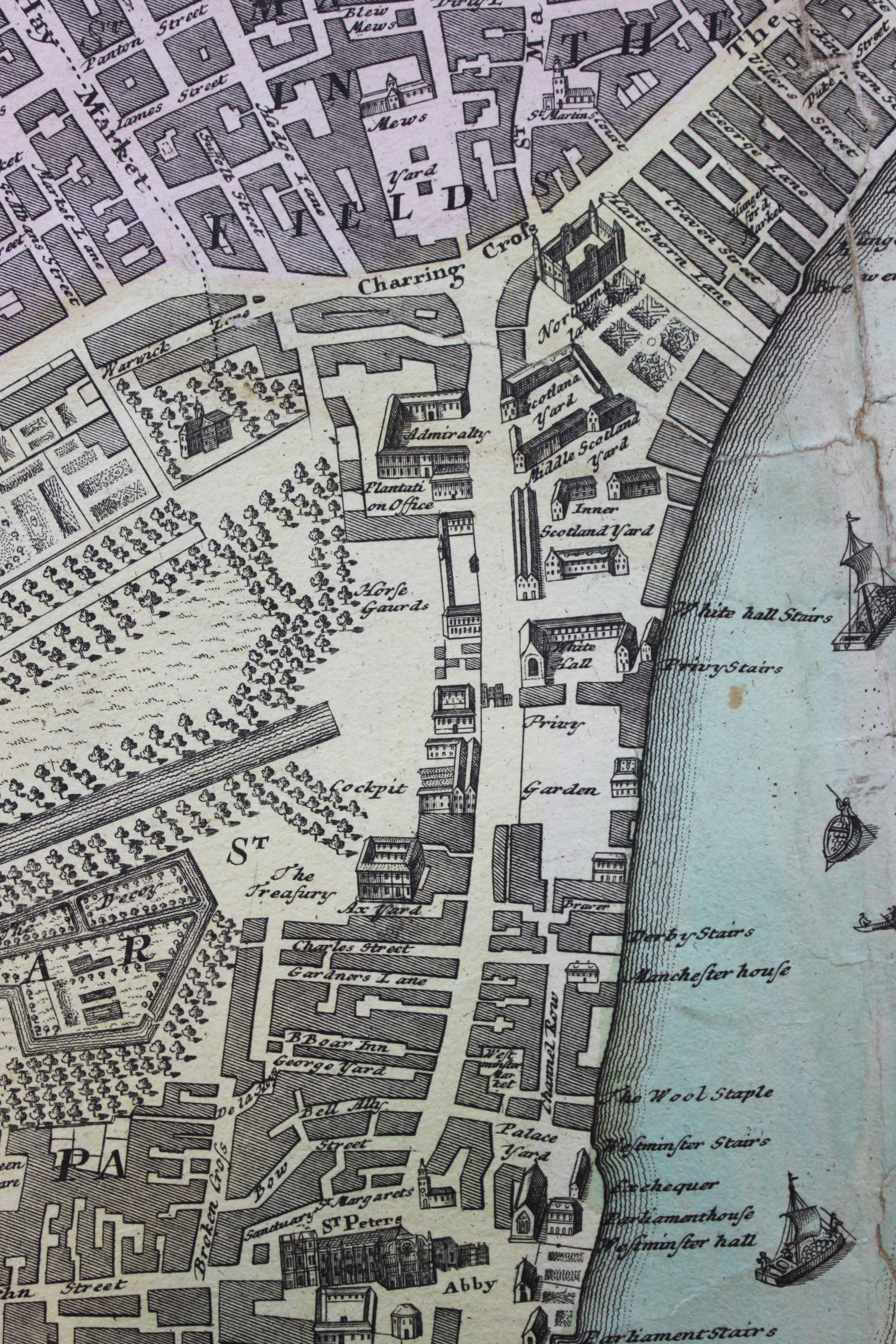 On 17 July 1717, King George I and his royal boat party set out from Whitehall Palace (beneath Inner Scotland Yard in this close-up) towards Chelsea, upon the Thames. On this occasion, he was treated to the first performance of Händel’s Water Musick. It is said that the King enjoyed this music so much, he requested it to be played at least three times throughout the voyage, including on the return trip.