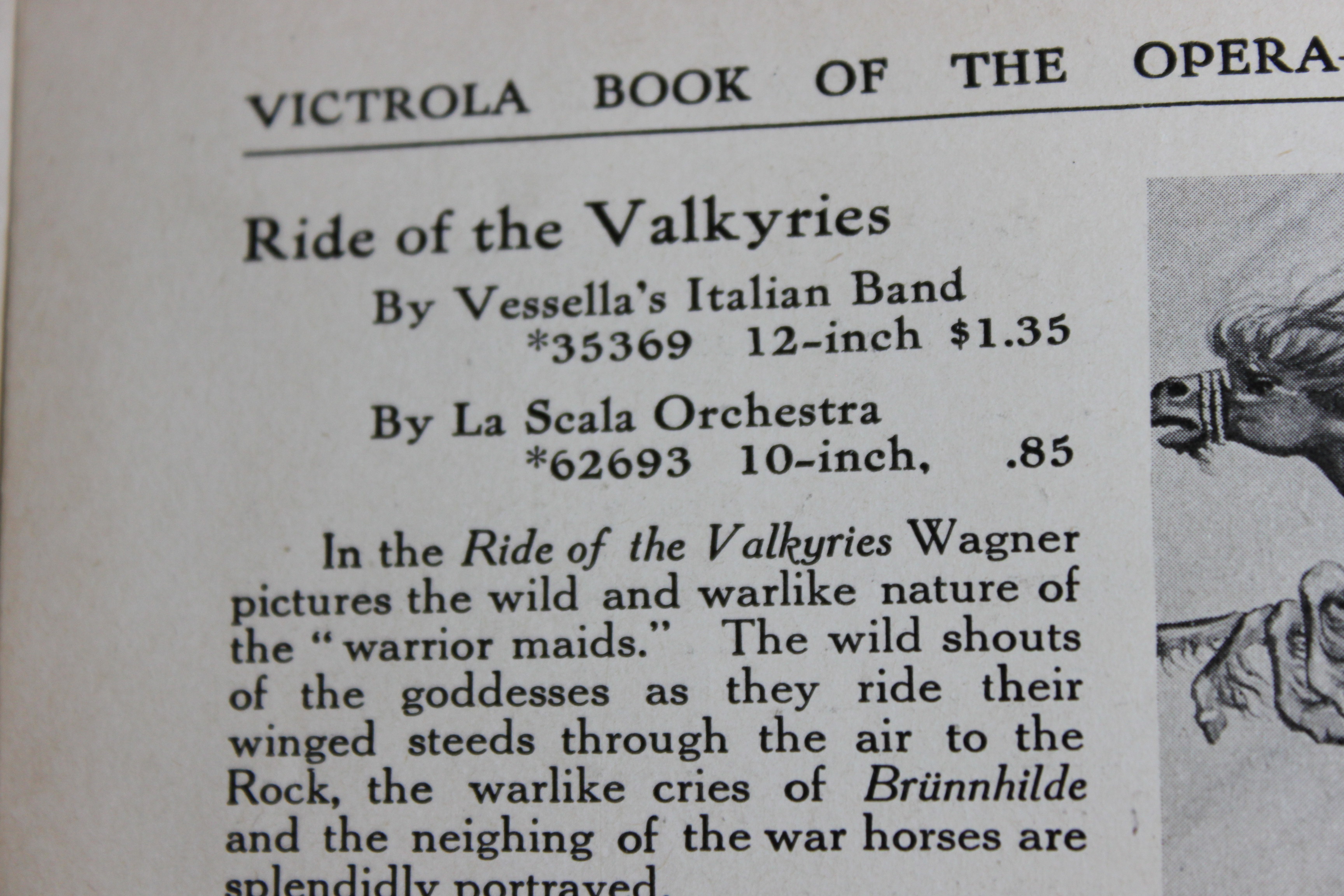 The Victor Talking Machine Company – an American company based out of Camden, New Jersey – was prominent in its manufacture of recordings in the early 1900s, due to collaborations with famous performers, such as the tenor Enrico Caruso. A famed record company with an iconic logo, by 1919 they had recorded [specifically] the Ride of the Valkyries twice, each of them being on a double-faced record. Though I was unable to find the recording of the La Scala orchestra, the one by Vessella’s Italian Band from 1914 can be found on YouTube (click the link to have a listen!).