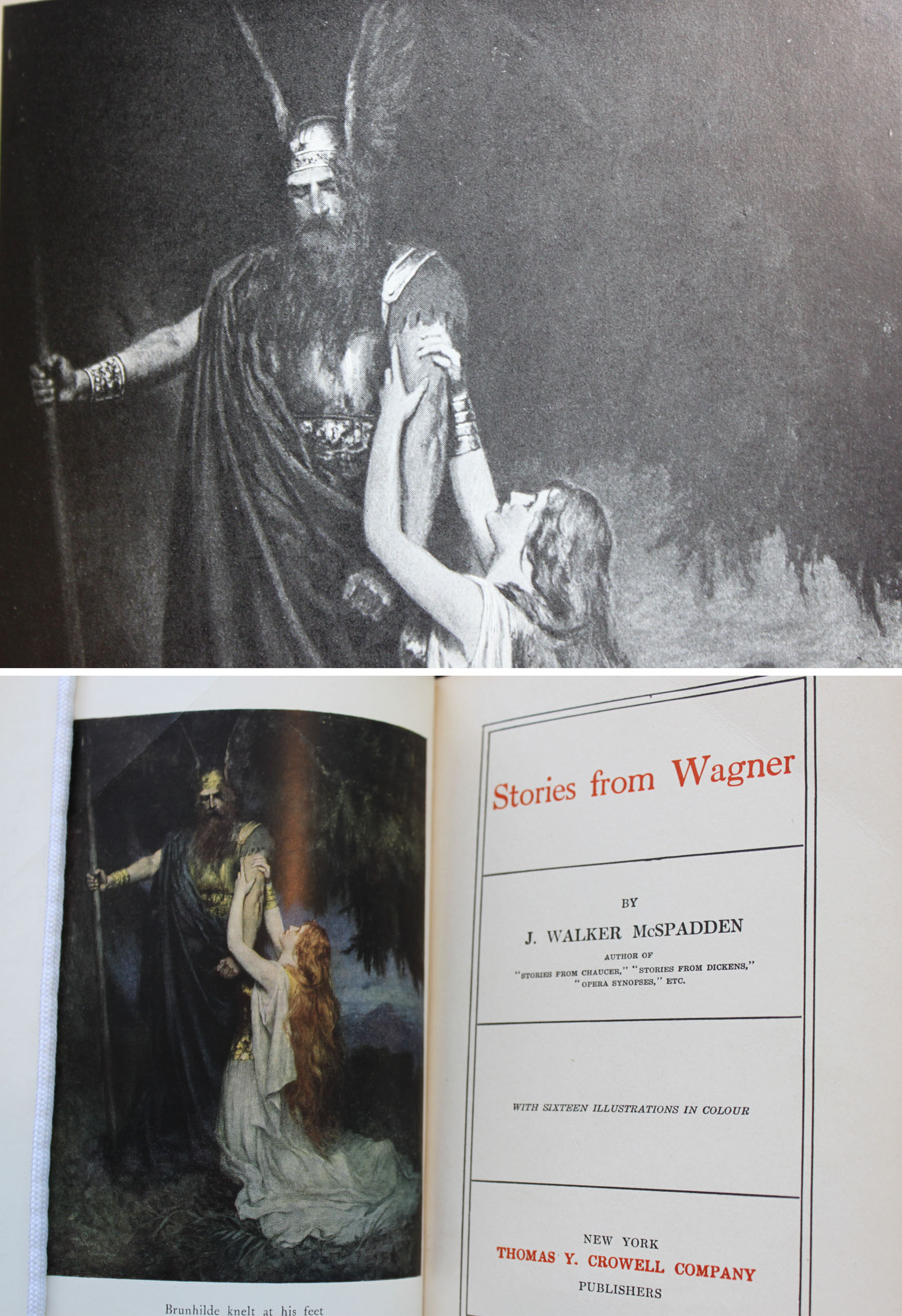 An interesting correlation between Stories from Wagner and The Victrola Book of the Opera is that this painting by Ferdinand Leeke (spelled Lecke in McSpadden) appears in both. The five-year difference in publication dates is especially fascinating, as I was not expecting the earlier reproduction of the painting to be in colour, whereas the later version is in black and white. Perhaps the use of this particular painting twice indicates that there are few artworks illustrating scenes from the Ring Cycle or even of Wagner’s operas in general. It would be interesting to find out how often this artwork has been reproduced in other books on the Ring Cycle!
