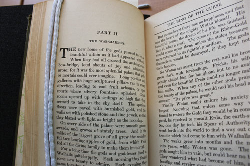 McSpadden uses approximate English translations for the opera titles of the Ring Cycle. The War-Maidens is equivalent to Die Walküre. (A valkyrie is a maiden in Norse mythology that chooses who lives and dies in battle; half of those who die are taken by the Valkyries to Valhalla, the home of the gods.) The book itself has an ornate cover, and is a part of the Wendi D. Slagle Decorated Bindings Collection. There are coloured plates of paintings within that depict various scenes from each of the stories.