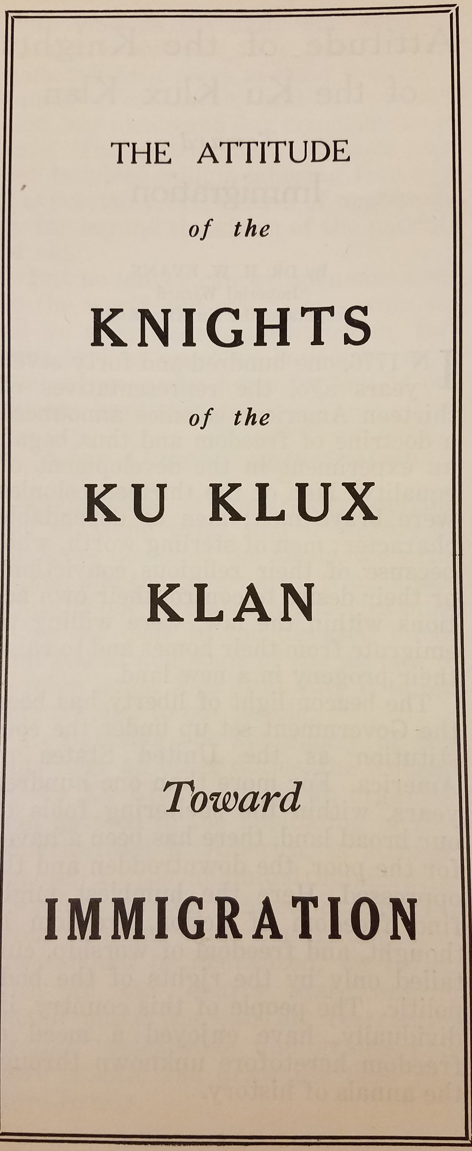 Dr. H.W. Evans, Imperial Wizard, Knights of the Ku Klux Klan, “The Attitude of the Knights of the Ku Klux Klan: Towards Immigration,” HS 2330.K63 E83 1923. Special Collections Research Center, George Mason University Libraries.