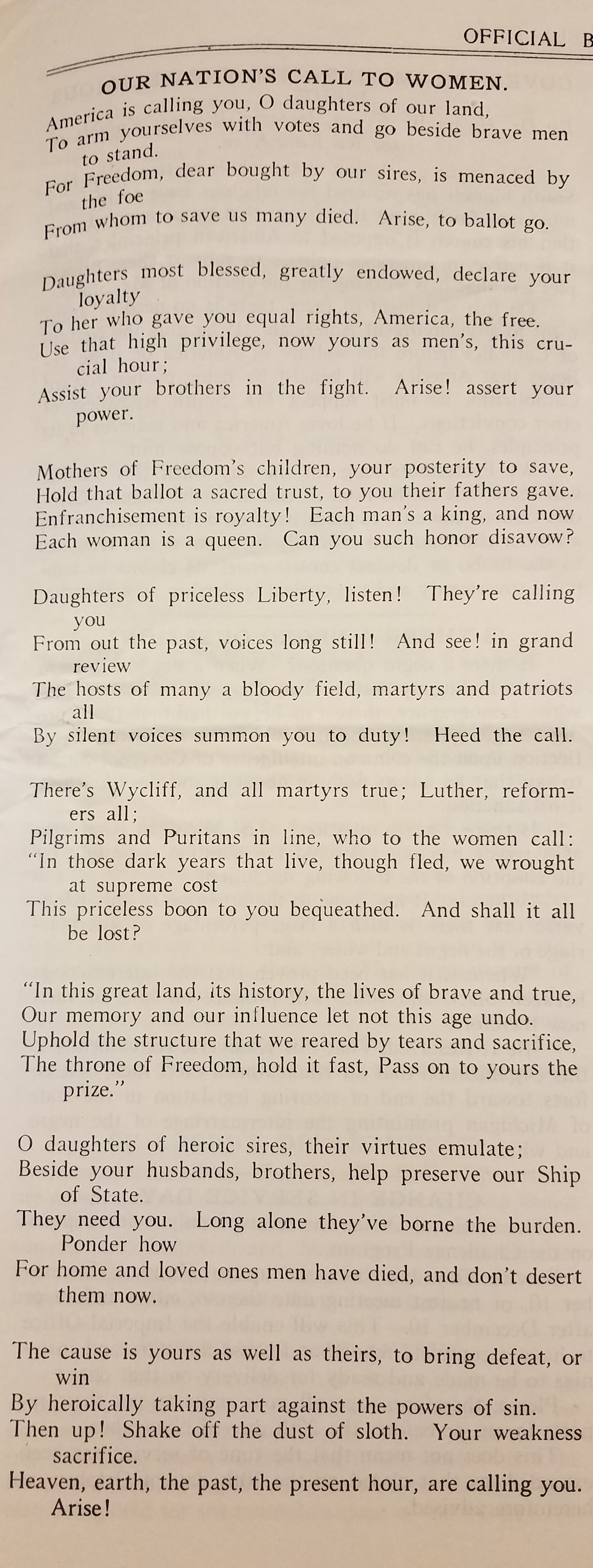 As the exhibit showcases several materials relating to the movement for women’s rights, the emphasis of the role of Klanswomen in the “Official Bulletin” is particularly relevant. The authors believe Klanswomen have a responsibility to participate not only in Klan life, but also in politics. Their vote is seen as so crucial, in fact, one contributor claims that: “Political observers of both parties are forced to admit that the women hold the balance of power in the coming election.”[6] By voting, Klanswomen are serving their country and the Protestant, Anglo-Saxon ideals of the Klan, fighting back against the influence of Al Smith and his dangerous Catholicism;[7] failure to vote constitutes a betrayal. “The good women of America will not sell out….In fact, no nation can rise above…the virtue and intelligence of its womanhood.”[8] The authors focus particularly on the possible repeal of prohibition to convince women to vote, equating prohibition with the virtues inherent in womanhood. It is “because of her instinct to protect the child she fights alcoholism in any form.”[9] The belief that women think differently and had different priorities than men was a common conception at the time, seen in Women in the Home, published in 1910 and currently in exhibit, which emphasizes the importance of women for the health and home of the nation.[10] Similarly, the Klan emphasized women as the protectors of Klan morality and identity, requiring them to vote to protect the values of Protestant women everywhere. The Ohio Broadcaster, also on display, thanked Klanswomen after the democrats were defeated, claiming that their victory was the signal of “a new epoch in the lives of Protestant womanhood,”[11] and would lead to increased membership and opportunities to spread their message.