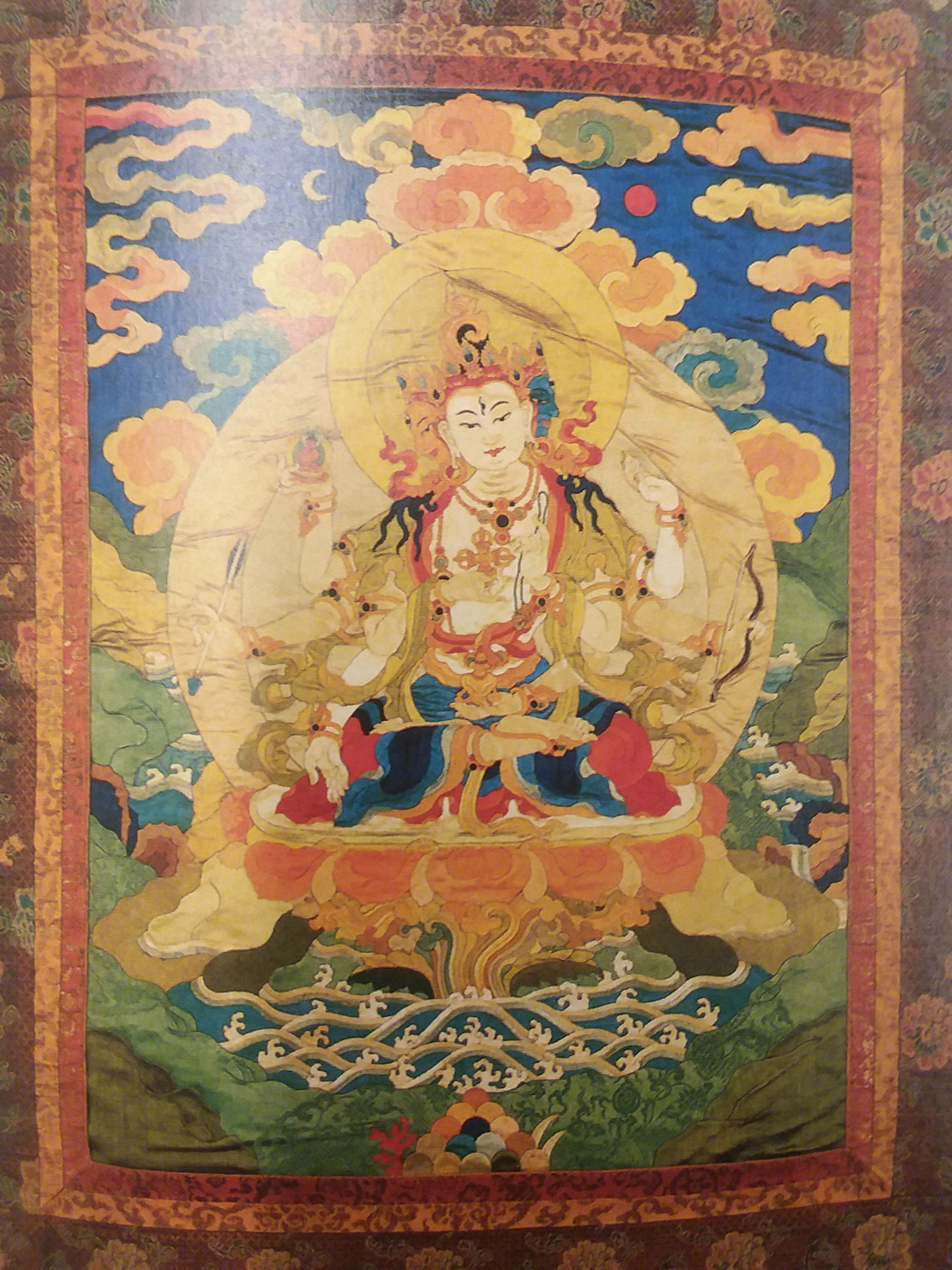 Below are pictures from the Encyclopedia of Buddhist Arts. Special Collections Research Center has a collection of 20 encyclopedias on various Buddhist art forms, including artifacts, architecture, rock carvings, sculptures and paintings. Pictured are various Buddhist artifacts that the encyclopedias showcase. A stone tablet shows the Buddha meditating under the Bodhi at Bodhgaya. The books also go into detail on a collection of Buddhist masks discovered at a monastery in Mongolia. Pictured is Yama, the wrathful god of death. (Yama) Many people are under the impression that there are no gods in Buddhism. However, there are millions of Buddhist gods! Shown is an embroidered silk scroll, created in 1691, depicting the compassionate and merciful Avalokitesvara. A second embroidery shows Usnisavijaya, one of the three longevity Buddhas. He is sitting on his lotus flower throne in the middle of a lake.