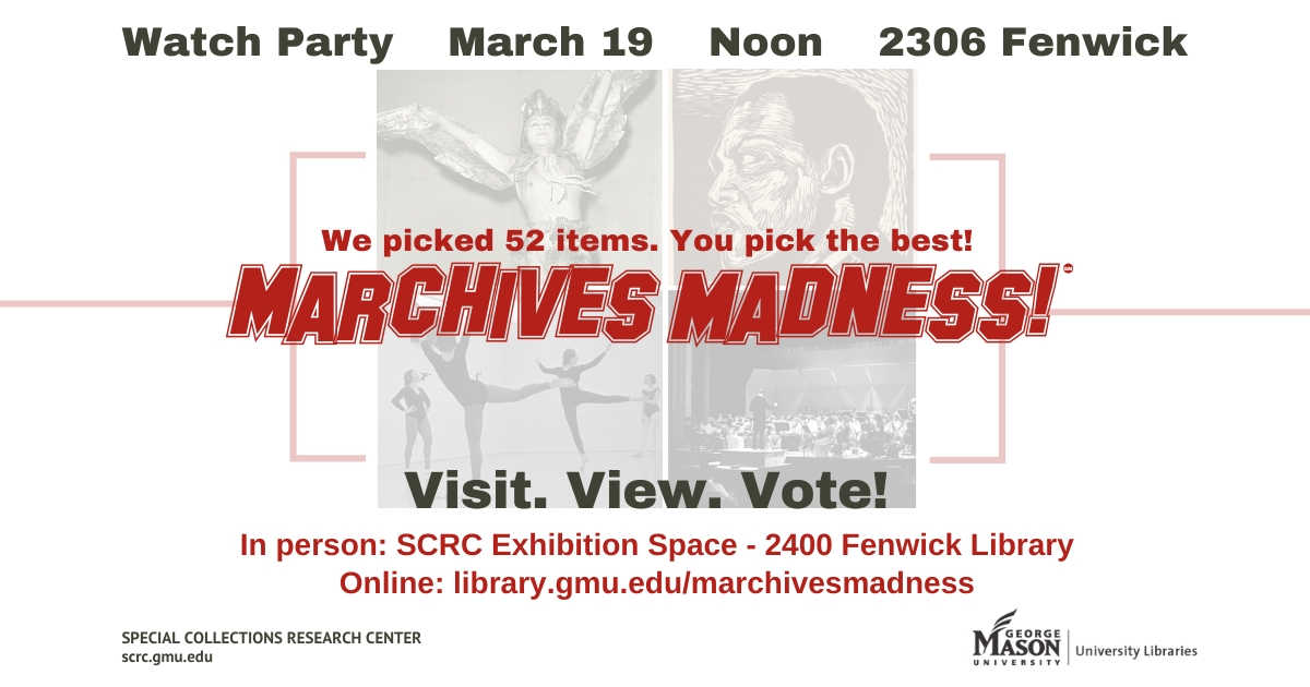 It is that time of year and SCRC is having another Marchives Madness contest. Our current exhibition is called “Showing Us Our Own Face”: Performing Arts and the Human Experience. All of the items have been digitized to replicate the physical exhibit as shown. To view all the items on line, go to our Flickr page. The Survey Monkey link is in the description at the top of the page. Voting for the top 24 ends March 8th. You can vote in person as well. See me if you would like a physical ballot.