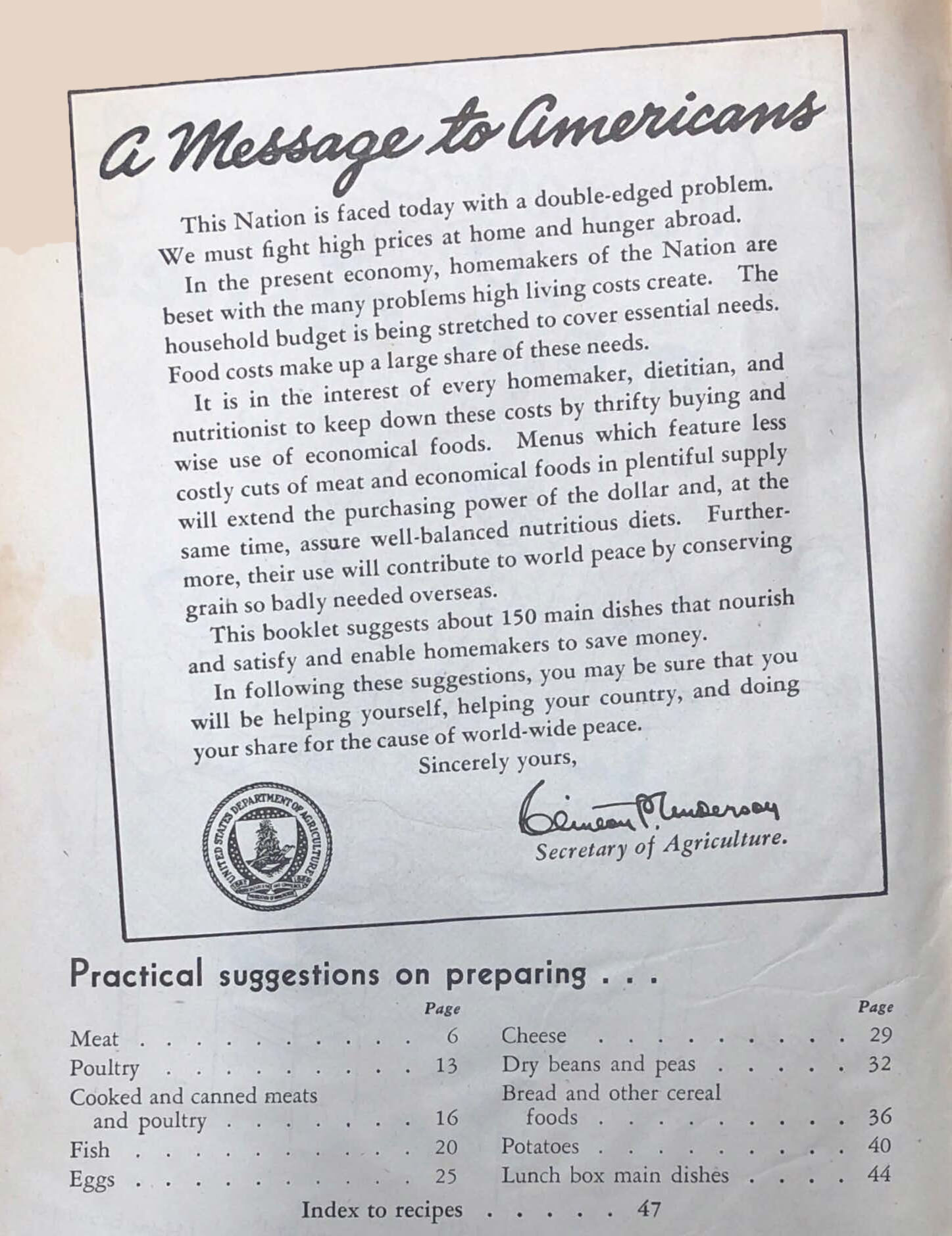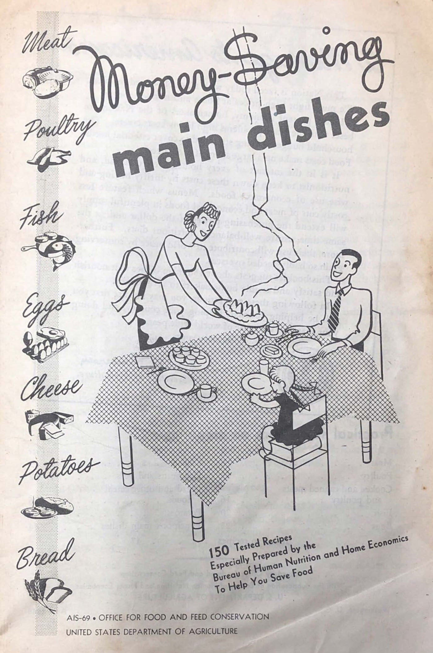 United States. Bureau of Human Nutrition and Home Economics. Money-Saving Main Dishes, TX715 .M65 1948, Special Collections Research Center, George Mason University Libraries.